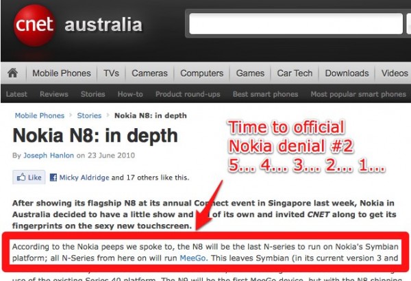 With MeeGo (Maemo’s oddly names successor) they’re loudly trying to differentiate ‘mobile computing’ from ‘smartphones’. N-Series has always been the top-end ‘mobile computing’ range (even when Symbian was being used to do the job badly, such as in the N97) so it is entirely logical that it would move to the newer platform which is better suited to the task. The problem is that by allowing this news to drip out slowly Nokia aren’t getting the opportunity to explain that devices as powerful as the N8 will still be made (and will still run Symbian) and will just be moved to more appropriate places in the naming convention.